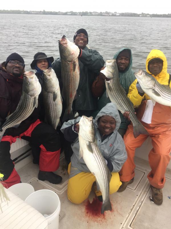 James, and Tony. Put in the mojos and went into search mode. Found a small pod of fish and went to work on Them, got our unders Limit with Lou and Rob popping Their striper cherries. Found a small pod of bunker and Started livlining,'catching and releasing another half Dozen.
