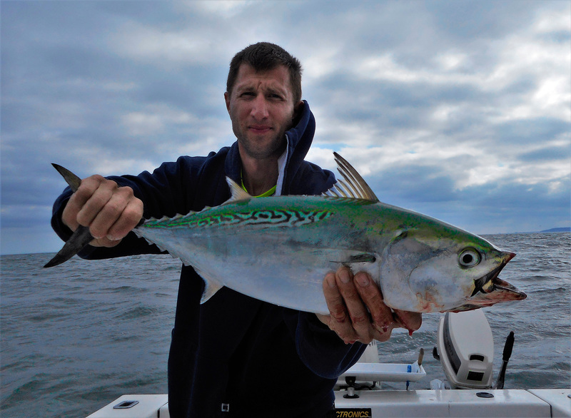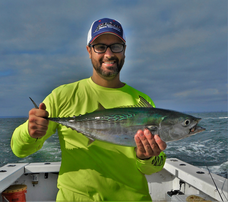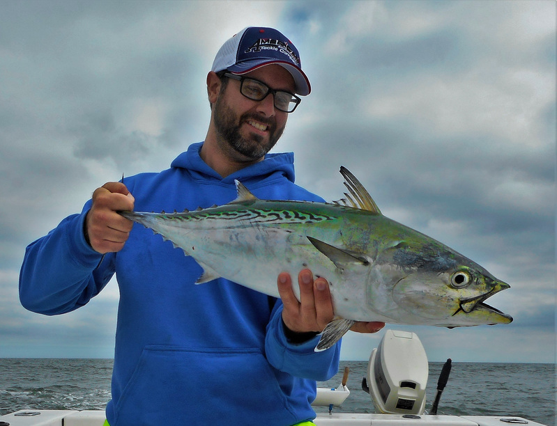 So as we're leaving we pass another spot that we almost fished first thing, only to find out thats where they crushed them in the morning... and to make things worse, we missed the entire tide and couldn't get a nibble from a tog after that! So after an entire morning of FAIL we were about to throw in the towel totally defeated when a 'ray of light' finally shined down on us! Eagle eye John spots some birds diving and we rush over...ALBIES! and we finally got them without blues in the mix! We started launching our lures at them, John with the epoxy jig and me with a jig i crafted from scratch. Some of the pods wanted a fast retrieve, some wanted a medium it seemed, but they were definitely aggressive and willing to hit! Only 1-2 other boats on them with us the whole time and they stayed up for over 1.5 hours before the bluefish joined the school. After the blues joined it was harder to get an albie bite and then it eventually totally died off. We hooked 8 had a few on/off and landed 5 on pretty light gear. It was a blast for sure; it'd been over a year since the last time i've hooked into one and i bested my personal record with a real nice 27", 8lbs (on the button)